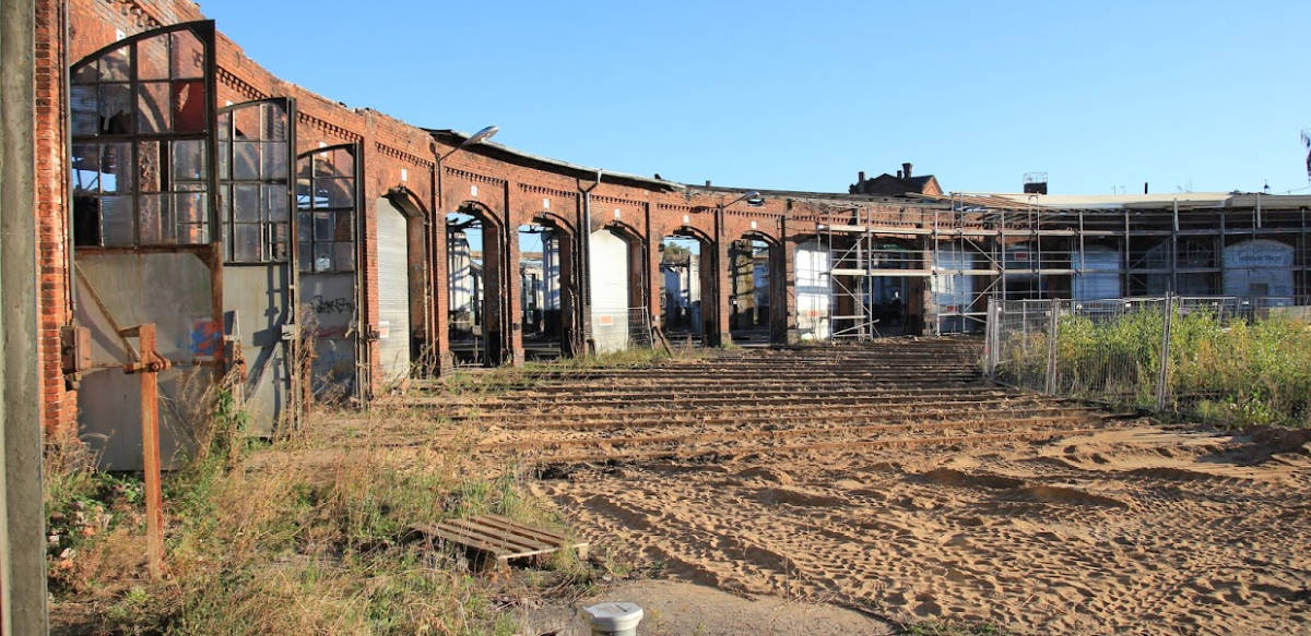 View of the former Magdeburg side of the station. This is where the trains went to and from the south until 1999. Today, our driver's cab rides take place here. A track-laying machine is also on display. The wasteland next to it has recently been revitalised by a road and a shopping centre.