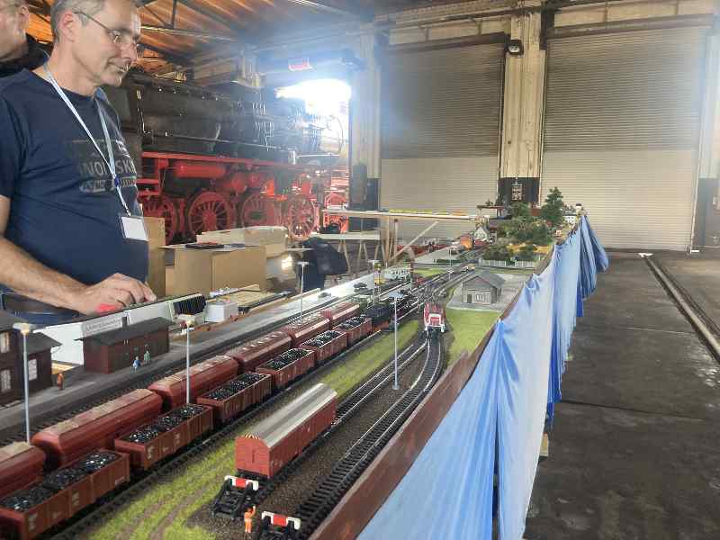 Als ein Highlight haben unsere Kollegen von der "kleinen Eisenbahn" aus Niedersachsen dieses Mal Teile ihrer Modellbahn aufgebaut. Dazu hatten wir extra ein Gleis im Lokschuppen freigeräumt, damit die Kollegen ihre Anlage unter Dach aufbauen konnten.
