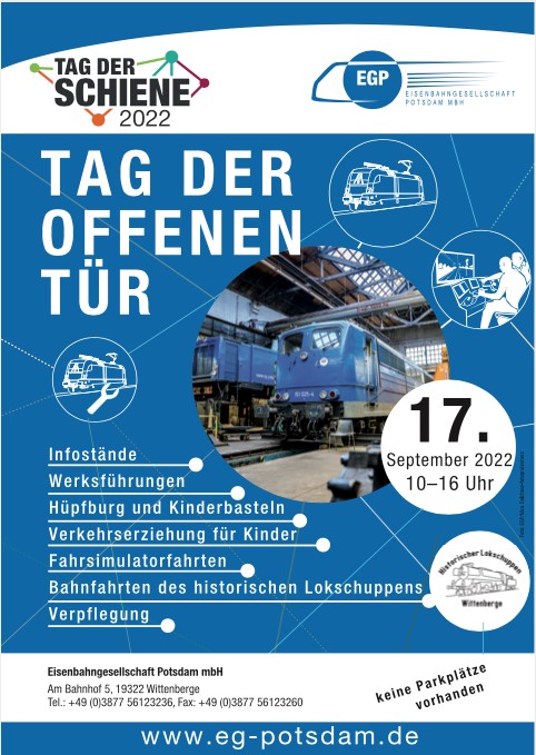 Next Saturday, 17.09.2022, the nationwide Rail Day 2022, our neighbours, the Potsdam Railway Company, are holding an open day at their workshop in Wittenberge. Visitors are invited to visit the company and locomotive shed III in Wittenberge between 10 am and 4 pm and find out about the work of the EGP. Of course, our museum in the Historic Locomotive Shed II will also be open and we will offer rides in the grounds with a small museum train.