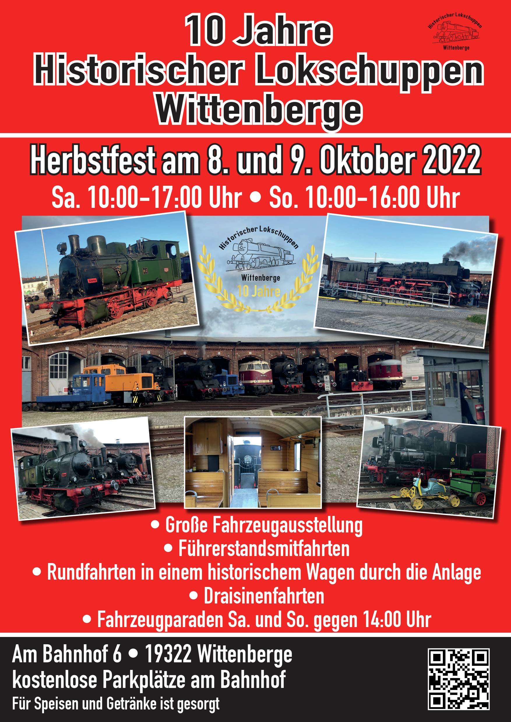 On 8 and 9 October, the Historische Lokschuppen Wittenberg will celebrate its 10th anniversary. You can visit us on both days between 10 am and 5 pm (Saturday) and 10 am and 4 pm (Sunday) and experience a lot. There will be a large vehicle presentation, round trips with the museum train, driver's cab rides and trips with the trolley. A number of guest vehicles have also registered. We will report on this as soon as the appropriate feeds and returns of the vehicles to and from their usual locations have been secured.