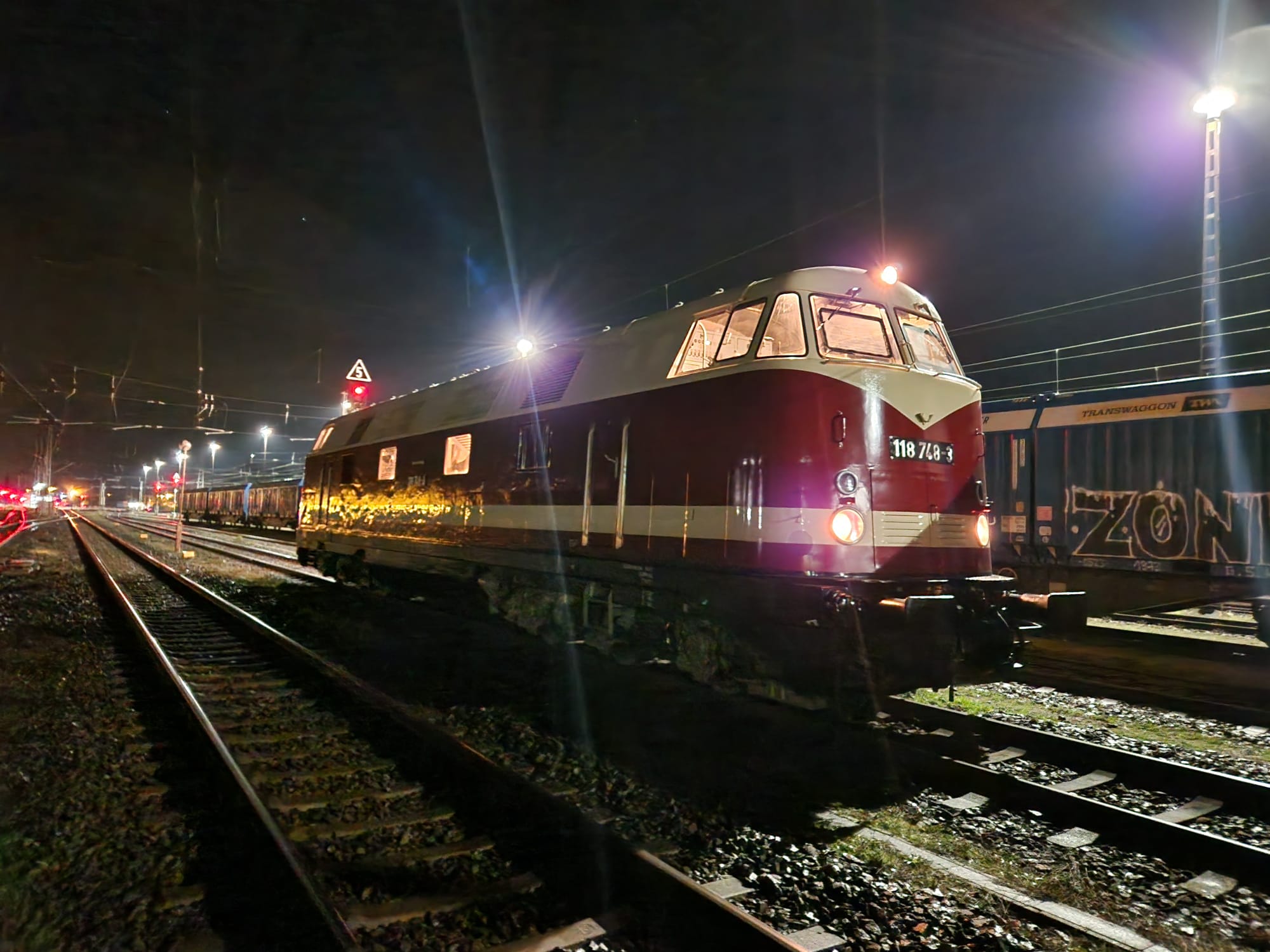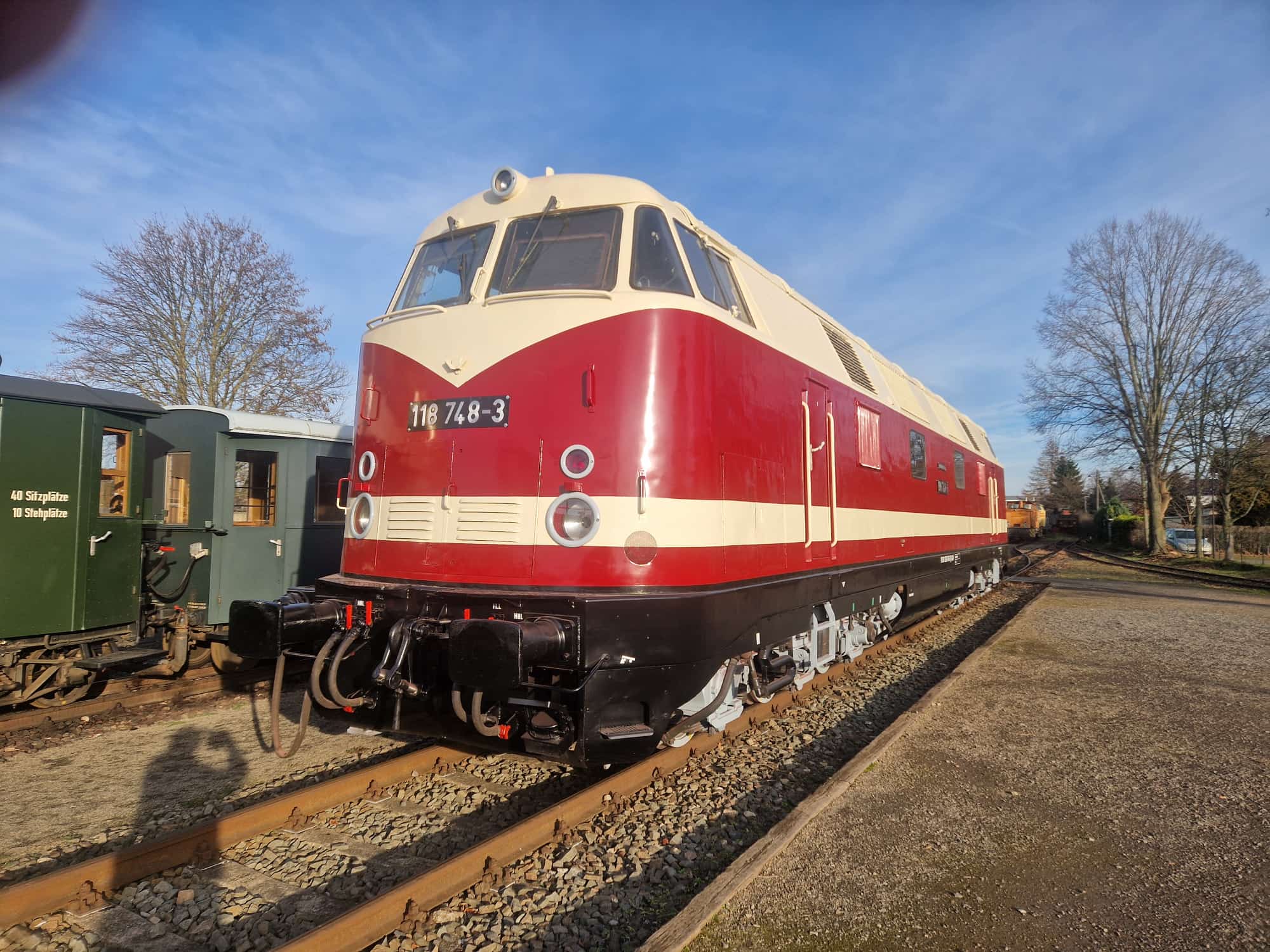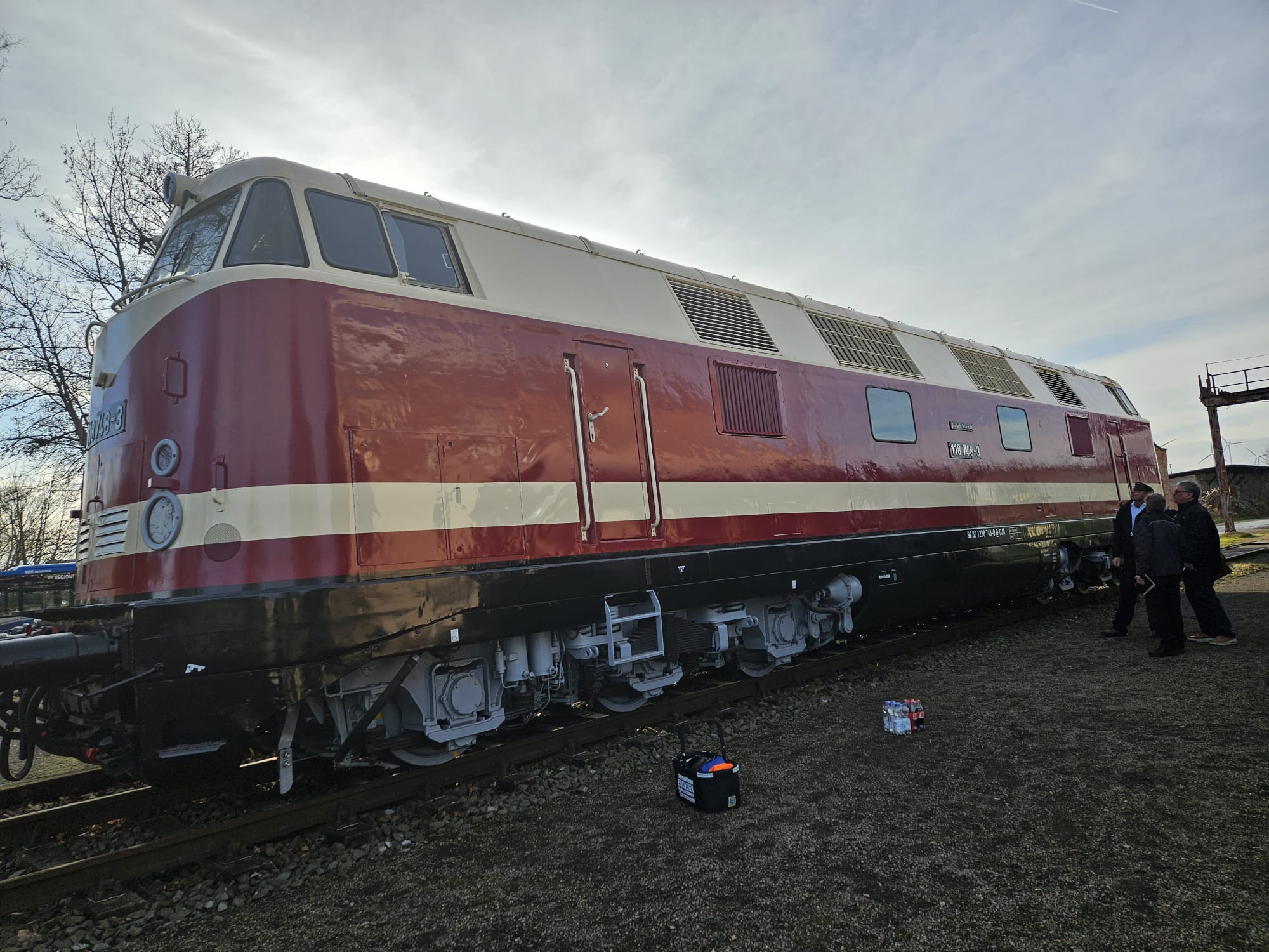 Another year has passed and we are approaching Christmas and the turn of the year. Of course, this is a time for thinking about presents. We are no exception. We are particularly delighted with our biggest Christmas present this year. Our diesel locomotive 118 748 is now operational again. A few words about the locomotive: it was built in 1968 at the Karl Marx Locomotive Factory in Potsdam-Babelsberg, has two diesel engines with 1,200 hp each and can reach a maximum speed of 120 km/h. This makes it a universal locomotive that was used for both passenger and freight transport. After being decommissioned by Deutsche Bahn AG in 1999, it was sold to Mitteldeutsche Eisenbahn, which passed it on to PRESS in 2020. Since then, it has enriched our vehicle collection, but so far only as a functional exhibit without track approval. In 2024, a member of our association acquired the locomotive.