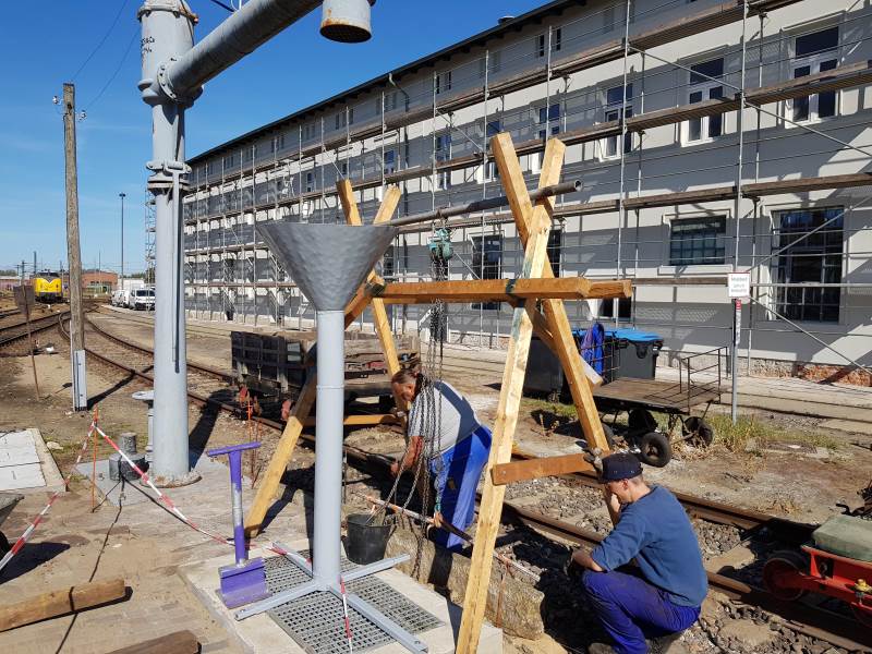 In addition, the paving work by the water crane in front of the locomotive foreman's office continued. Granite edges were laid here and since each stone weighs about 300 kilos, a makeshift wooden lifting device was specially made to lift the stones from the trolley and place them in their final position.