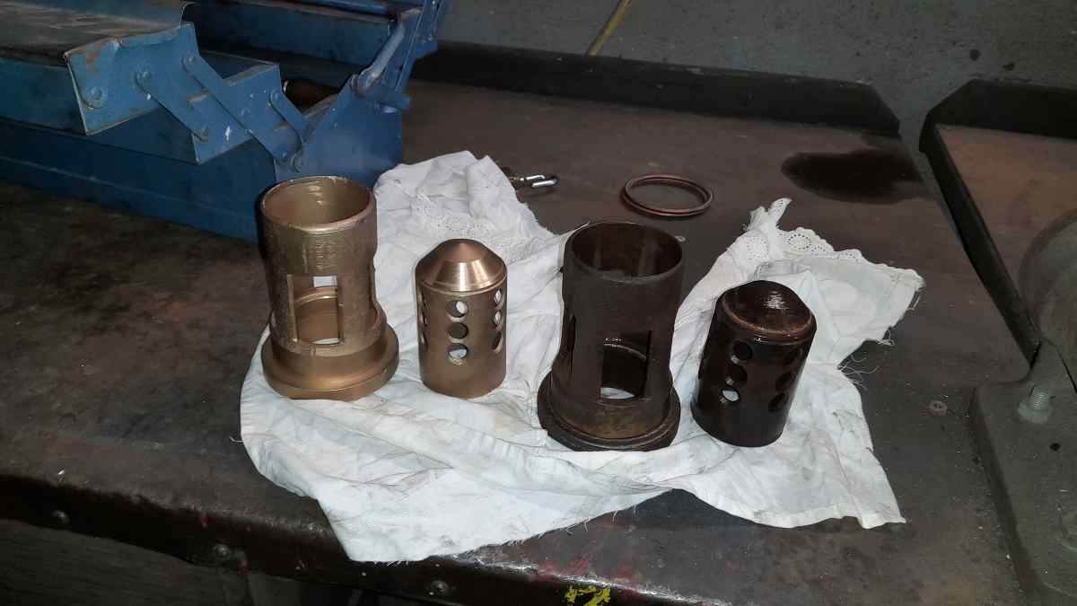 Bei 50 3570 wurden die Rückschlagventile ausgebaut. Sie dienen dazu, die Leitungen abzudichten, über die während des Betriebes frisches Wasser in den Kessel nachgespeist werden kann. Die Ventile bestehen aus zwei Teilen: Einerseits ein Gehäuse mit einer Dichtkante darin und andererseits der eigentliche Ventilkörper. Letzterer läuft am Ende kegelförmig zusammen und wird durch den Dampfdruck im Kessel gegen den Sitz im Gehäuse gepresst. Wird nun eine Pumpe angestellt, wird der Ventilkörper durch den Pumpendruck aus dem Sitz gehoben und Wasser kann durch den Spalt strömen. Die Teile sind aus Messing gefertigt, damit sie nicht rosten. Messing ist jedoch ein relativ weiches Metall. So kann es passieren, dass sich durch das Schließen des Ventils eine Furche im Ventilkörper bildet, wenn dieser wieder auf den Sitz gedrückt wird. Dadurch wird das Ventil im Laufe der Zeit undicht. Ventilkörper und –sitze müssen daher regelmäßig auf der Drehbank nachgearbeitet werden. Hier ein paar Bilder vom Ausbau und der Bearbeitung eines Ventils und ein Vergleich vor und nach der Bearbeitung.