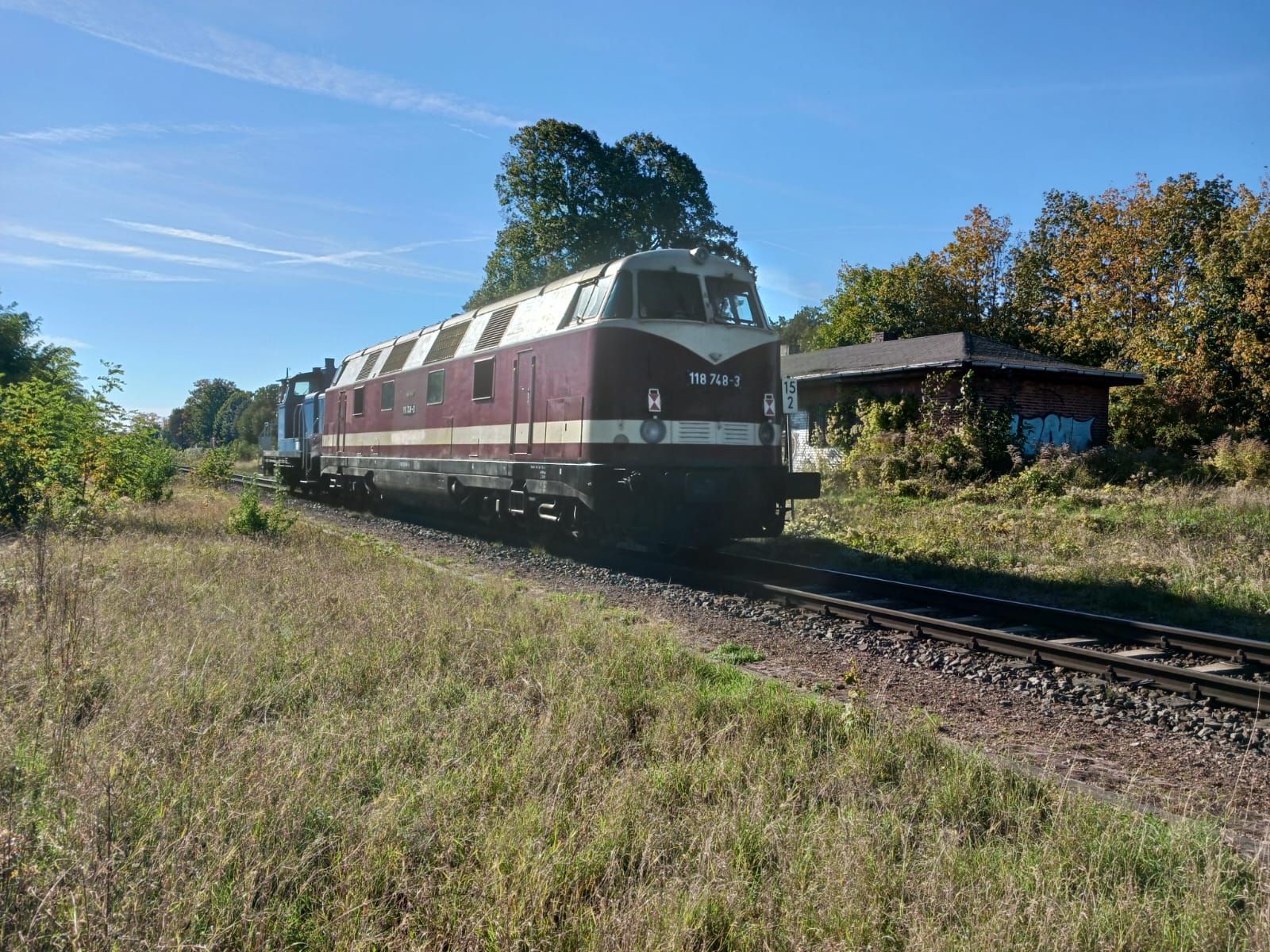 At this point we can also reveal a secret: The diesel locomotive 118 754, which was previously kept in our museum as an exhibit, was towed to Mansfelder Land at the beginning of the week. In a workshop in Klostermannsfeld, the locomotive will undergo a major overhaul over the next few months. Once this work has been completed, it will hopefully be available again for journeys throughout Germany. We are extremely pleased about this and will report on the progress of the work here from time to time. The following pictures show the train before departure in Wittenberge and near Förderstedt south of Magdeburg.