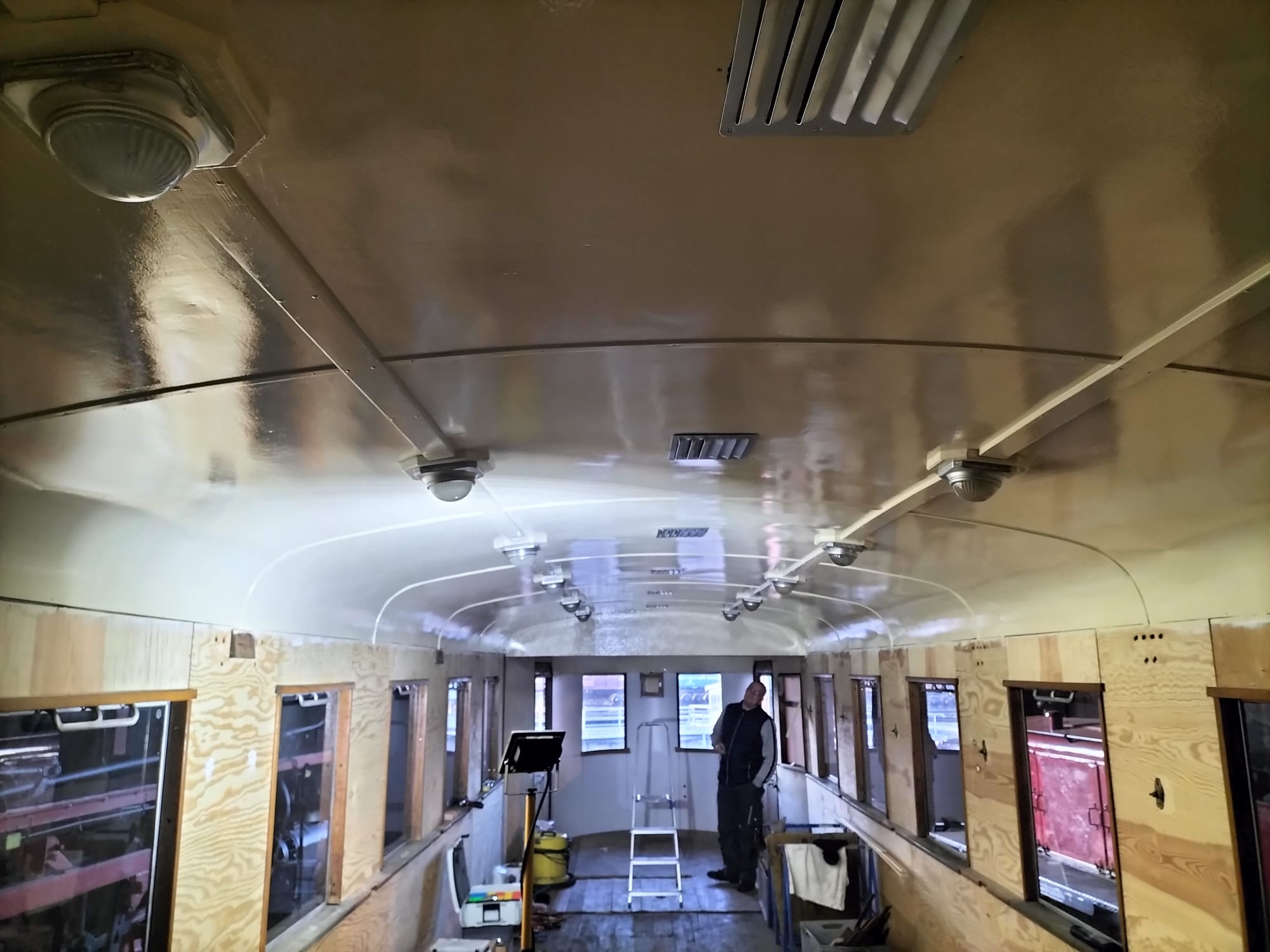 Work also continued on our coach 197 805. Now that all the ceiling panels and ceiling mouldings have been installed, the ceiling can be painted. We hope that we will soon be able to lay a new linoleum covering on the floor.