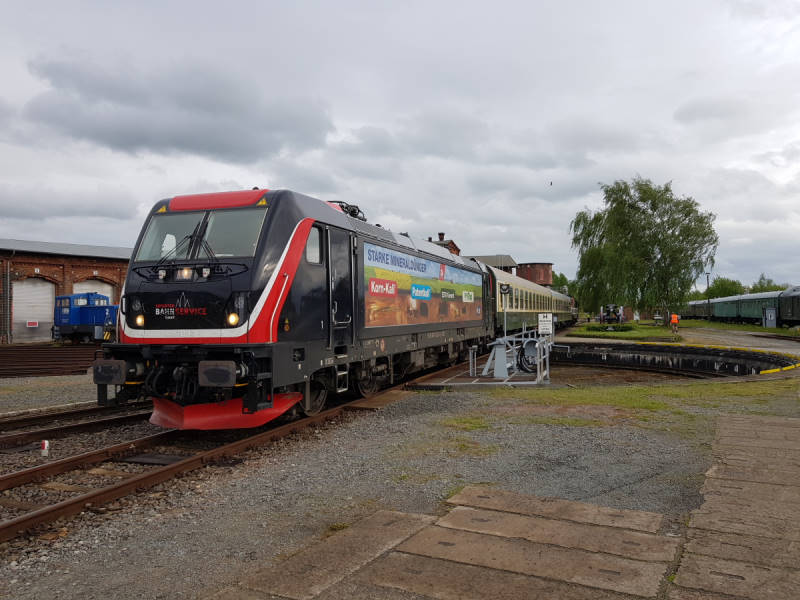 In the early evening we received a visit from the company "Erfurter Bahnservice", which has the order to bring a locomotive of our neighbours, the Railway Company Potsdam, to a railway museum in Weimar. For this purpose, a modern hybrid locomotive was used which draws the power for its traction motors from the overhead wire or from a built-in generator. Also on board were two passenger coaches to provide sufficient braking power, as the brakes of the exhibit to be transferred are no longer functional.