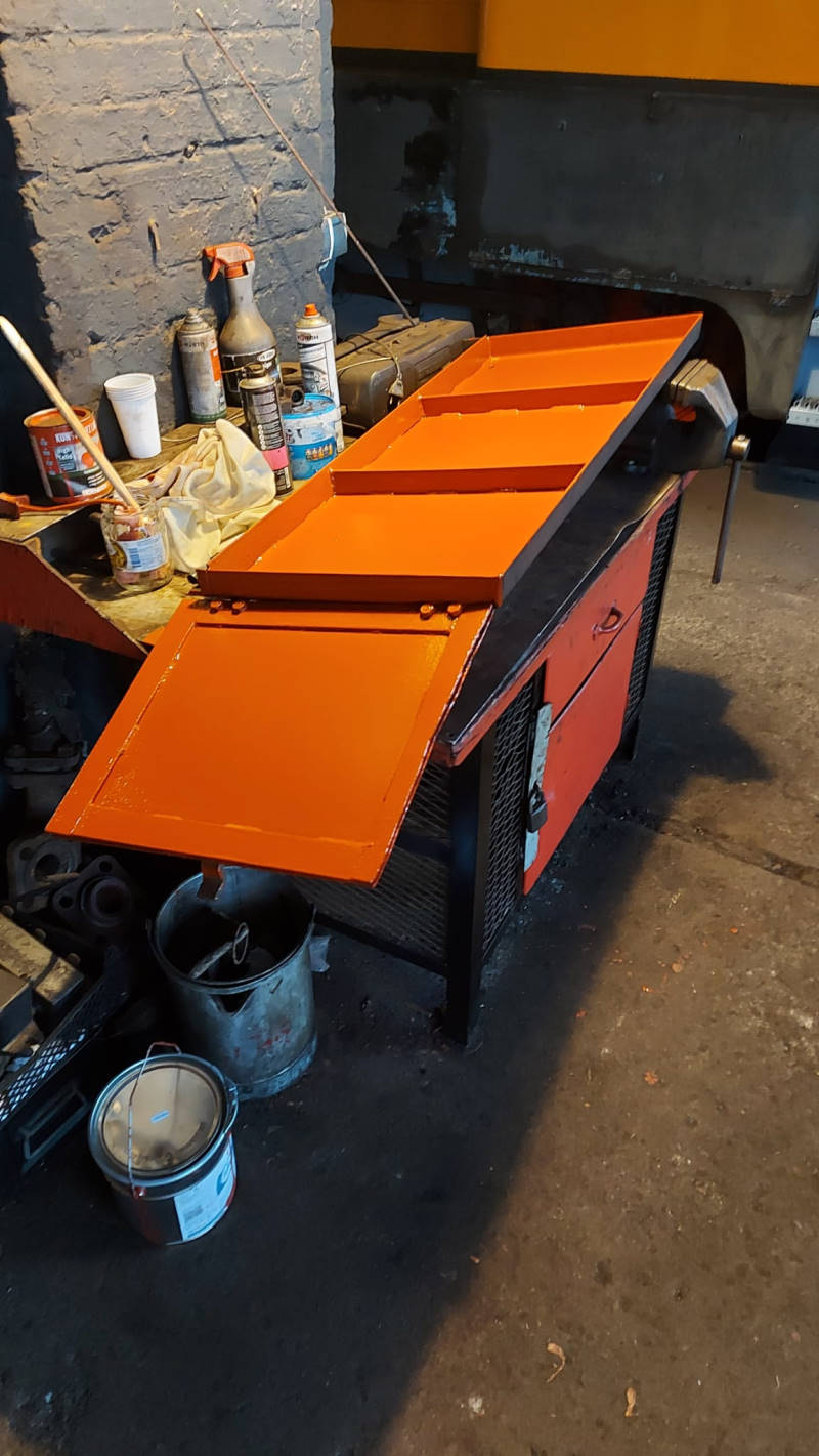Zunächst nimmt die farbliche Gestaltung der Diesellok V23 Formen an, die zukünftig die Nummer 102 076 tragen wird. Der obere Teil der Lok ist inzwischen orange lackiert. Die schwarze und graue Farbe am Fahrwerk wird noch ausgebessert. Dann werden die Lokschilder angebracht, die über die Nummer und den Heimatstandort Wittenberge Auskunft geben. Die Lok soll zukünftig mit dem Beiwagen 197 805 eingesetzt werden, über dessen Aufarbeitung wir weiter unten berichten.