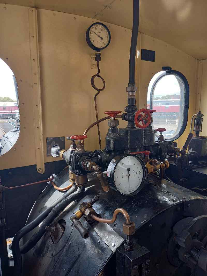 Nachdem die kleine Lok am Standort Wittenberge grundlegend überholt und mit neuen Kesselrohren ausgestattet worden war, erfolgt nun die sogenannte Warmdruckprobe. Dabei wurde der Kessel angeheizt und auf Höchstdruck gebracht um zu sehen, ob noch irgendwelche Leckagen bestanden, die einem Einsatz entgegenstehen könnten. Das war zum Glück nicht der Fall und im Beisein des Kesselprüfers konnten die Sicherheitsventile auf den zulässigen Betriebsdruck eingestellt werden. Das folgende Bild zeigt einen Blick in den Führerstand während des Anheizens. Im Vordergrund erkennt man (auf der Seite liegend) das geeichte Prüfmanometer des Kesselprüfers. Auf dem darauf folgenden Bild erkennt man, wie ein Sicherheitsventil eingestellt wird. Es muss sich in dem Augenblick automatisch öffnen, wenn der höchst zulässige Betriebsdruck überschritten wird.