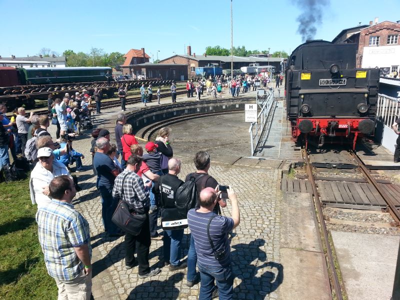 Der Lokschuppen öffnete erstmals nach der Winterpause seine Tore für das Publikum. Endisch schilderte seinen Gästen, wie man überhaupt Lokführer werden konnte. "Grundsätzlich hatte man einen Beruf im elektrischen oder metallverarbeitenden Bereich. Man musste in die Werkstatt, hatte vier Wochen Heizerausbildung und fuhr dann mit einem Lokführer mit", so Endisch. Er zählte weitere Ausbildungsstationen auf. "Nach mehreren Jahren ist man dann fertig." Das sorgte für erstaunte Gesichter bei den Besuchern. "Na ja, man muss ja alles kennen, ein Gefühl für die Technik bekommen. Die Lok spricht zu ihnen", so Endisch, der auch berichtete, dass ein Lokführer zu DDR-Zeiten durch Prämien bis zu doppelt so viel verdiente, wie ein Arzt an der Charité. Hart sei die Arbeit auf einer Lok immer schon gewesen. "Im Winter musste man die Heizkohle teilweise mit einem Hammer losklopfen, wenn sie nicht mehr nachrutschte", so Endisch, der mit einem Augenzwinkern nachschob, "wenn Sie weniger als 400 Überstunden hatten, galten sie fast als Arbeitsverweigerer". Wie aufwendig der Dampflokbetrieb ist, zeigt der Fakt, dass eine Lok vier Wochen durchgehend lief, bis zur nächsten technischen Überprüfung. Sie wieder hochzuheizen hätte zwölf Stunden gedauert, im täglichen Betrieb unmöglich.